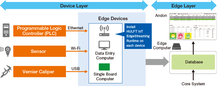 Introducing HULFT IoT provides a runtime module that can be installed on a variety of IoT devices, such as PLCs and single board computers, and enables writing of collected information directly to databases.