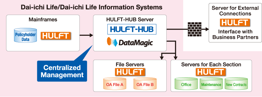 As a result, the company chose HULFT and HULFT-HUB to build their desired common infrastructure for internal and external file transfer, and DataMagic as a much-needed solution for character code conversion during file exchanges between mainframe systems and open systems.