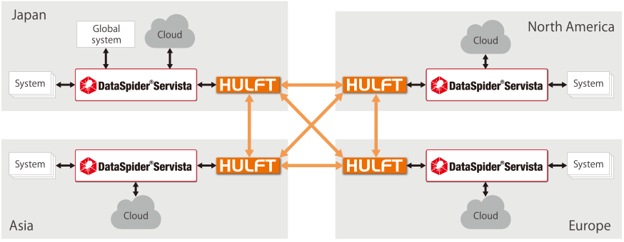 Currently, the data accumulation and conversion service has been deployed throughout the world. The data accumulation and conversion servers used in Japan and in various regions in North America, Australia, and Asia are installed on an IaaS infrastructure, and data integration is achieved via an internal Group WAN. DataSpider is used, in combination with HULFT, for data integration within each region. The timing at which data integration is performed depends on the data’s purpose of use. For some data, once a day is sufficient. For other processes, such as accounting processes, however, data is exchanged as often as once every 30 minutes. The company is currently in the process of deploying data accumulation and conversion servers in China, and is considering future deployment to Europe.