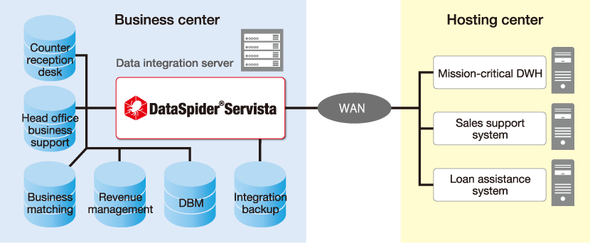 Currently, even as the bank proceeds with the originally planned renewal of the data utilization platform, DataSpider is being flexibly utilized in situations where data integration is needed. Specifically, DataSpider is being used for a variety of applications, such as performing business matching among customers by using data from the sales support system, and data integration for the database management system that serves as the data utilization platform.