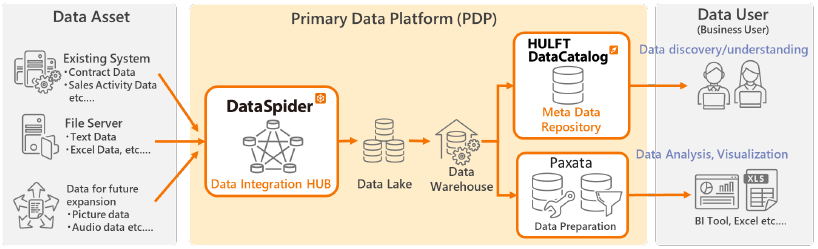 The PDP incorporates two products from Saison Information Systems (Now Saison Technology). One transfers data from source systems such as mission-critical systems, business systems, and file servers to the PDP. DataSpider Servista allows users to freely search aggregated data, and to easily understand the meaning and output of the data.