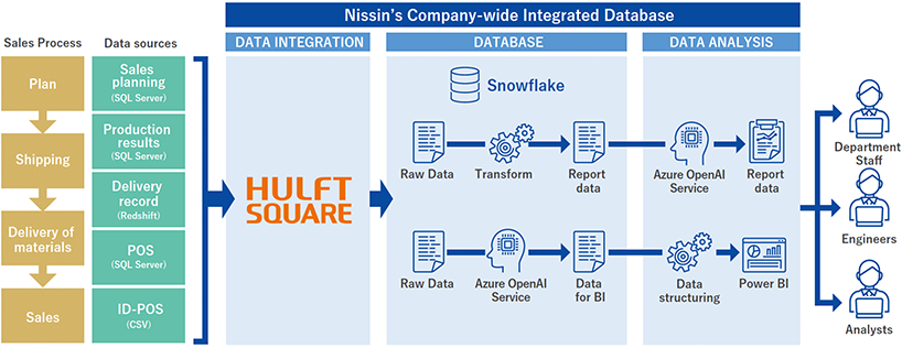 One initiative is to establish a foundation that contributes to data-driven management, and to achieve this, Nissin is establishing a data integration/analysis platform. HULFT Square, a cloud-based data integration platform (iPaaS), is the data integration platform that aggregates partially optimized data from each system and inputs it into a Snowflake data warehouse.