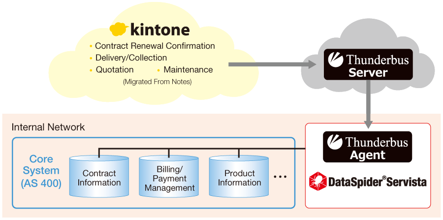 By combining DataSpider's HTTP triggers with kintone and Thunderbus in the cloud, basic information for contracts, billing, and payments in the on-premises systems could be integrated with data for items such as quotation, delivery, collection, and maintenance without needing to use dedicated lines or specialized hardware.