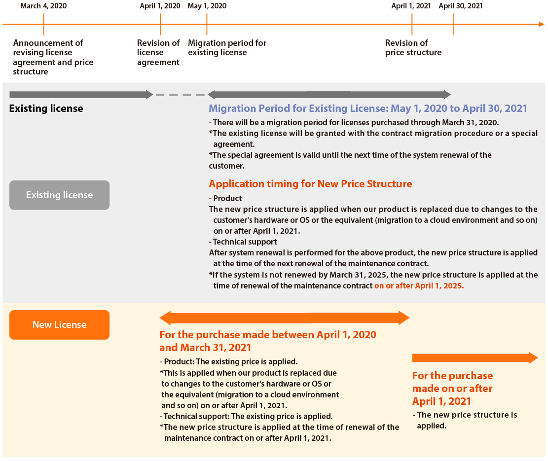 If our Product needs to be replaced on or after April 1, 2021 due to a hardware OS renewal or equivalent renewal by the customer (e.g. changing to a cloud environment, etc.), a price difference between the new price and the current price may occur*.