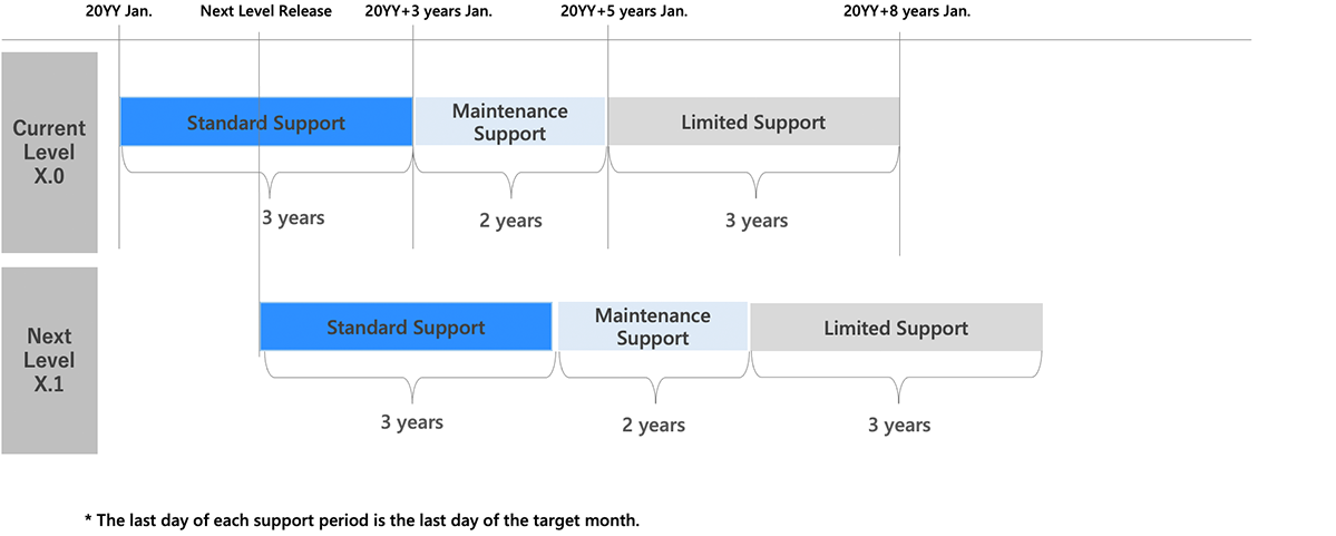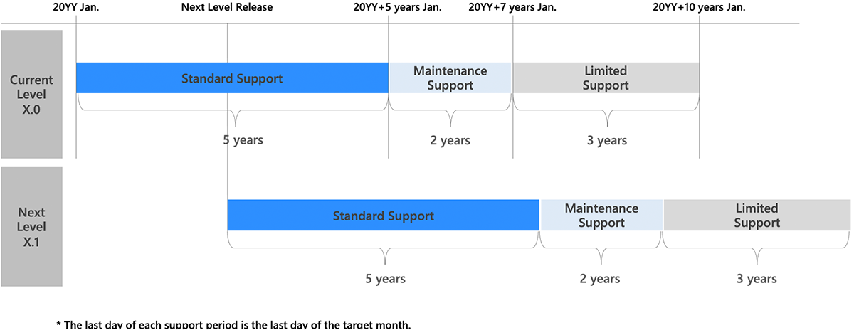 The period of time during which the level of support is provided is determined by the level of the product, and is announced when the latest level is released.