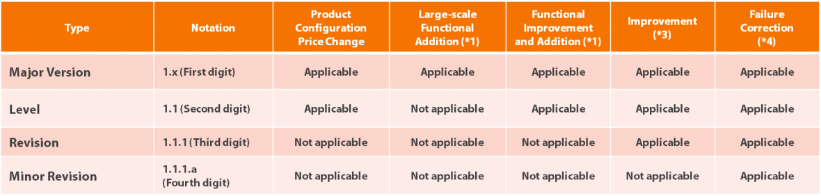 The version number of our products is defined based on the rules shown below. The version is managed using the "major version" number, the "level" number, the "revision" number, and the "minor-revision" notation.