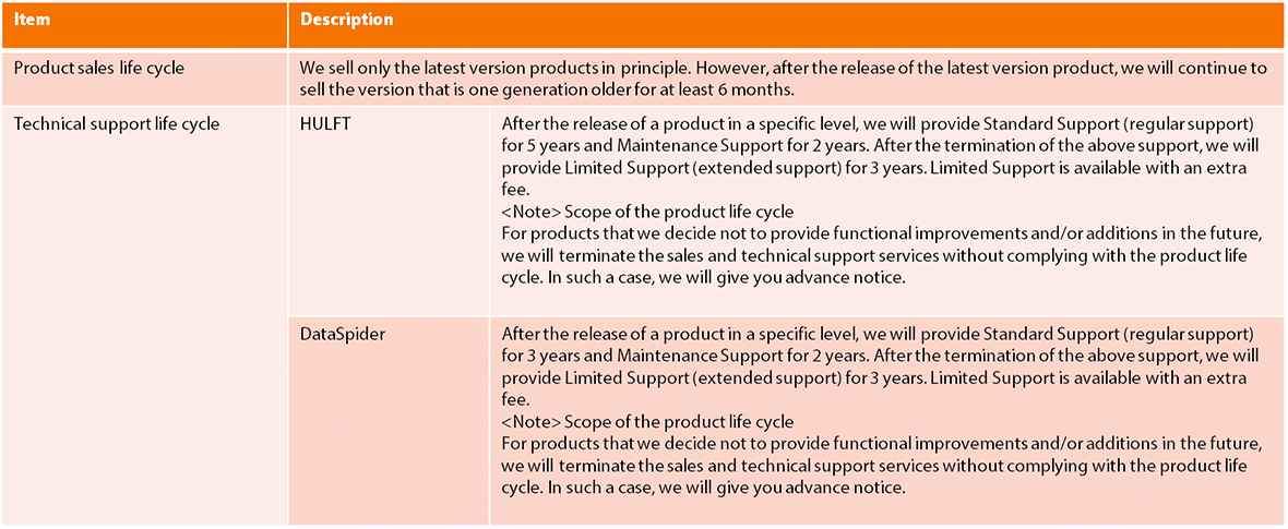 The range of technical support provided for HULFT products depends on the support level, which is determined according to what stage of support the released version is currently in.
