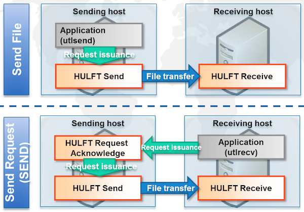 File transfers are done with HULFT instances installed on both the sending and receiving server. The sending server can use a push-type command, known as a "Delivery Request,” to send the files to the receiving server. Alternatively, the receiving server can use a pull-type command, referred to as a "Transmission Request,” to initiate from its side.