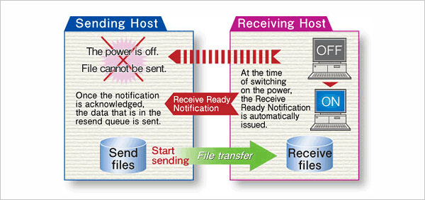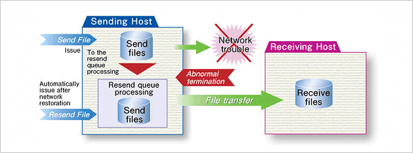If a problem occurs with the transfer, HULFT can automatically execute a resending process after the network connection is restored. Also, in cases where the receiving host could not receive a file due to a trouble, the Resend Request can be issued to re-activate the sending process of the remote host.