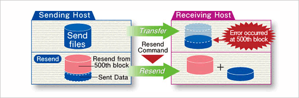 If an error occurs during data transfer, it is possible to resend from the point where the error occurred by issuing a Resend File command.