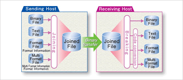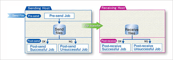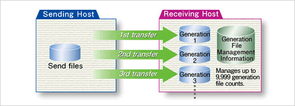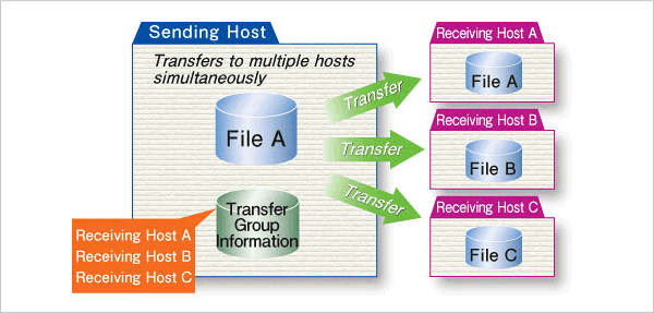 The most basic function of HULFT is to transfer a file from one host to another. The file transfer can be initiated from either the sender or the receiver. Other functionality includes: