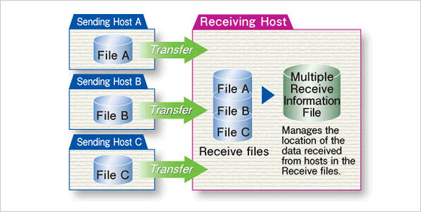 You can receive data of the same type from multiple remote hosts using the same file ID and append them to a single file.