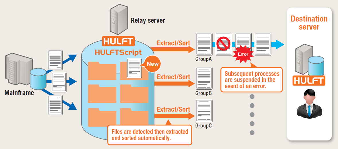 Simply save files in a folder on a relay server to automatically extract and sort transfer files. HULFT Script can be used to create a script that suspends subsequent transfers in the event of a transfer error and prevents overrun.
