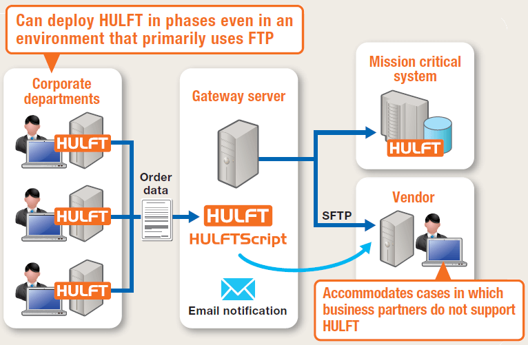 Perhaps you may like to use SFTP/FTP in some situations. Or, perhaps you would like to migrate your systems from SFTP/FTP to HULFT in stages. HULFT Script can connect to SFTP/FTP servers without altering the HULFT environment. Compatible with Windows, Linux, zLinux, and UNIX.