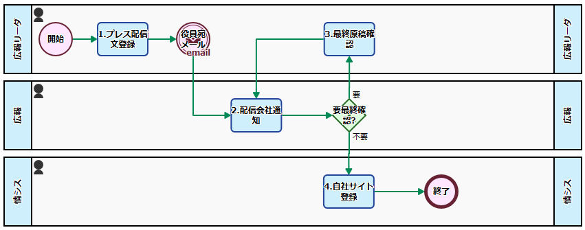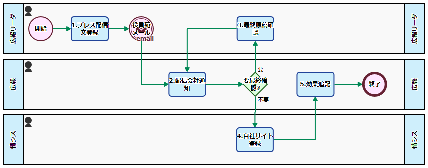 プレスリリースとして配信する原稿が作成されると、広報リーダはBPM上でプロセスを開始し、配信内容をシステムに登録します。すると、プレスリリースに関する様々な関連業務が、BPM上で管理され処理されます。