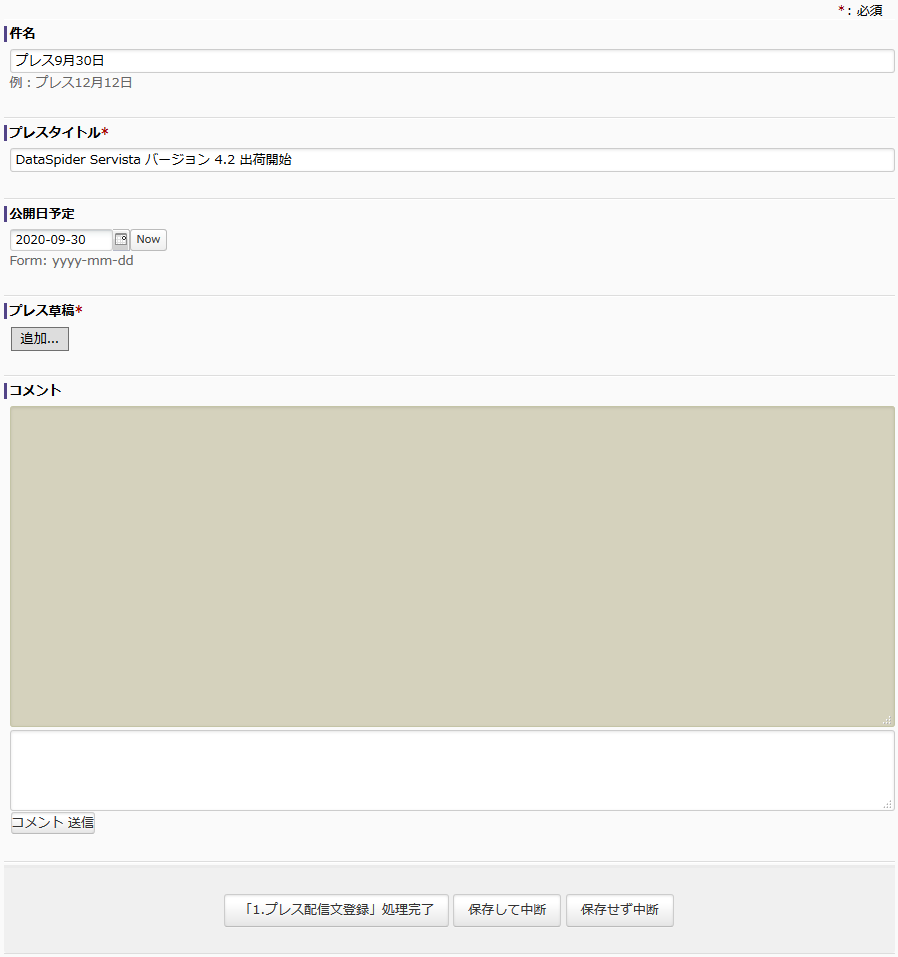 広報担当者はプレスリリース配信代行各社の配信システムに対し、それぞれのシステムのフォーマットにあわせて配信する原稿を登録し、BPMで作業完了を入力します。