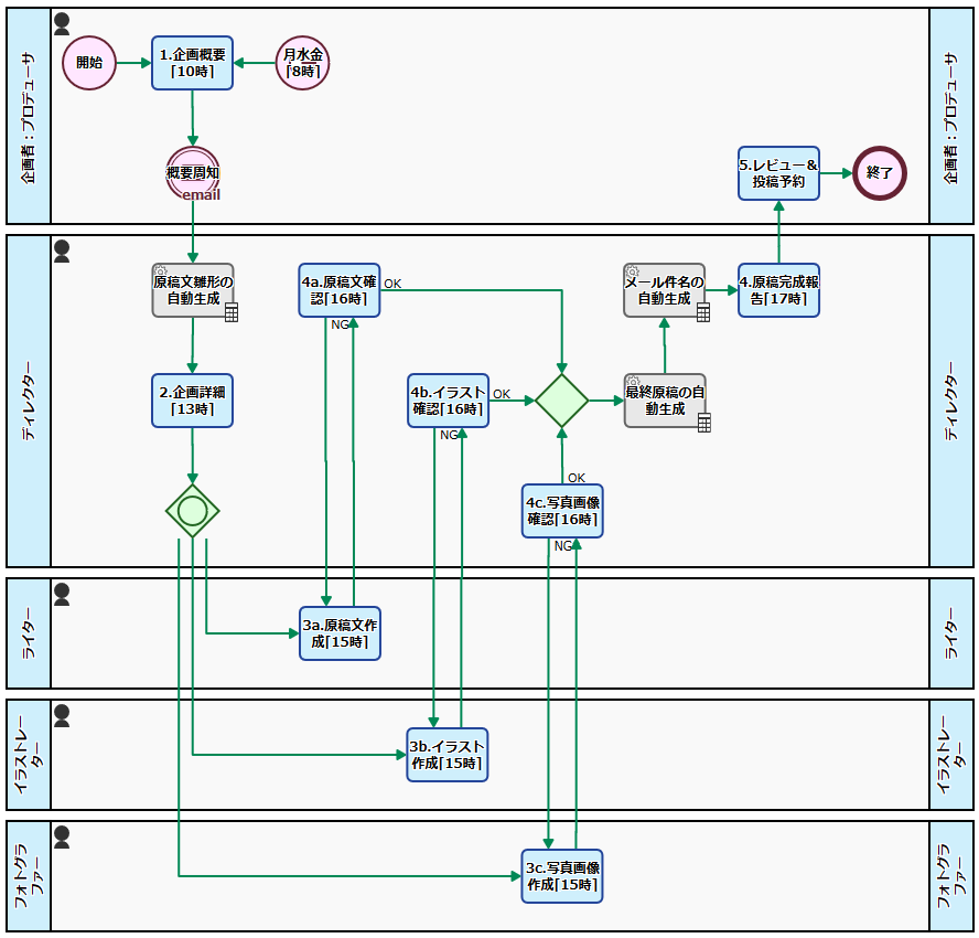 企画詳細がまとめられると、内容に応じて担当者にタスクが割り当てられます。「ライター」に文章を作成するタスクが(3a. 原稿文作成 [15時])、イラストが必要な場合には「イラストレータ」に(3b. イラスト作成 [15時])、写真が必要な場合には「フォトグラファー」に(3c. 写真画像作成 [15時])タスクが割り当てられます。