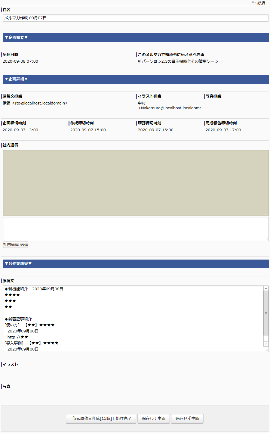 企画概要ができると、原稿の雛形が自動生成され、「ディレクター」に企画の詳細を作成するタスクが割り当てられます(2. 企画詳細 [13時])。ディレクターは13時までに企画詳細をまとめます。