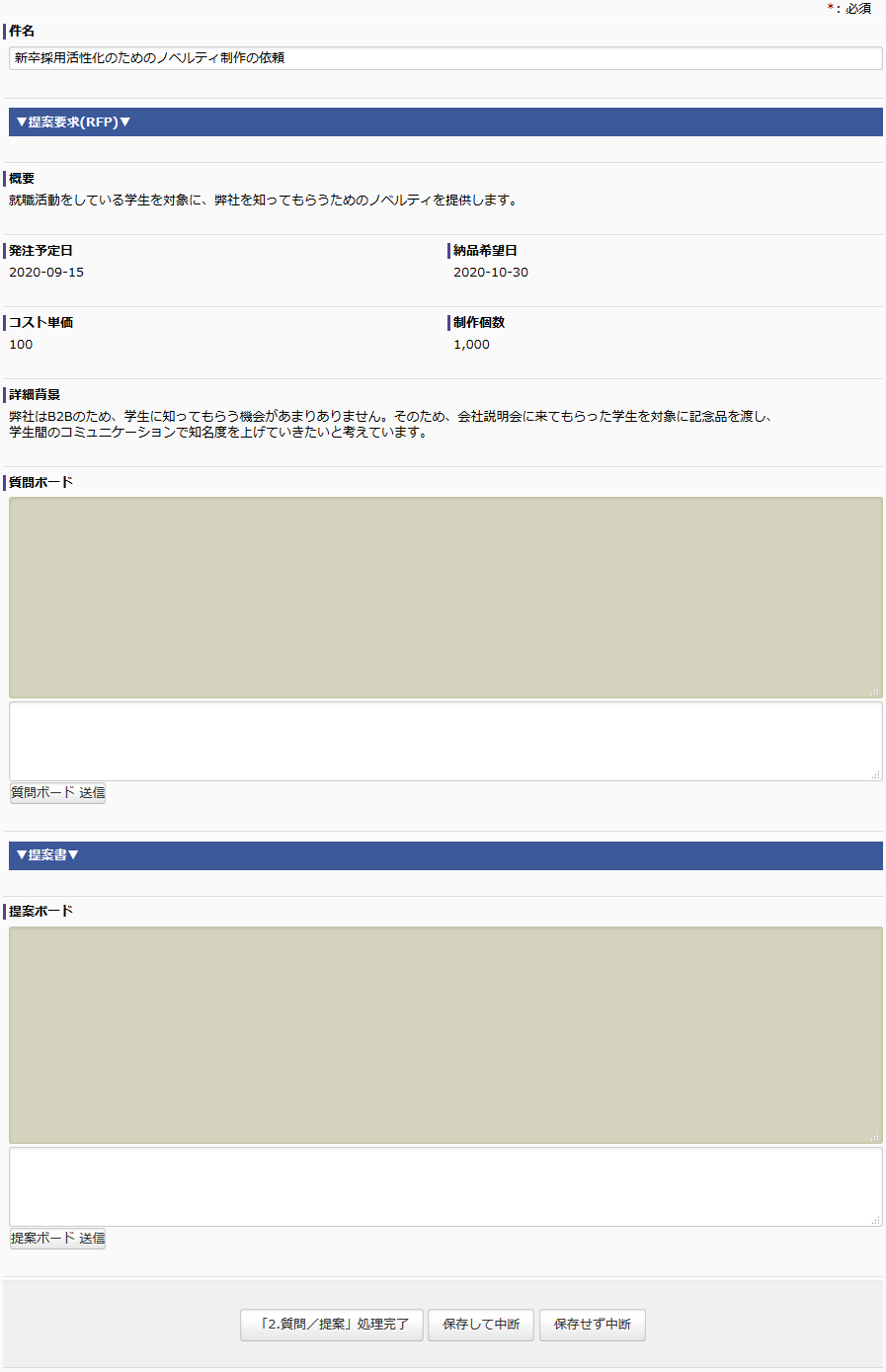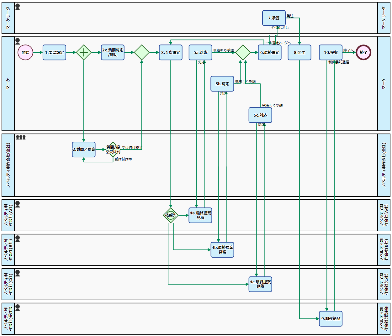 提案要望はすぐにノベルティ制作会社各社に提示され、オープンなコンペティション形式で各社から質問を受け付けながら提案をもらいます(2. 質問/提案)。マーケティング部の担当者は、各社からの質問に対応しつつ、提案が揃ったところで受け付けを締め切ります(2x. 質問対応/締切)。