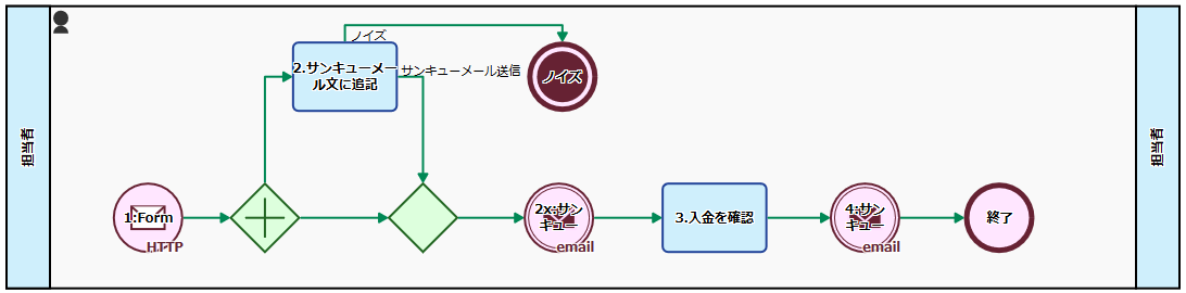 申込者へサンキューメールが送付された後、入金を確認するタスクが割り当てられます。入金確認後、申込者に再度サンキューメールが送信されます。
