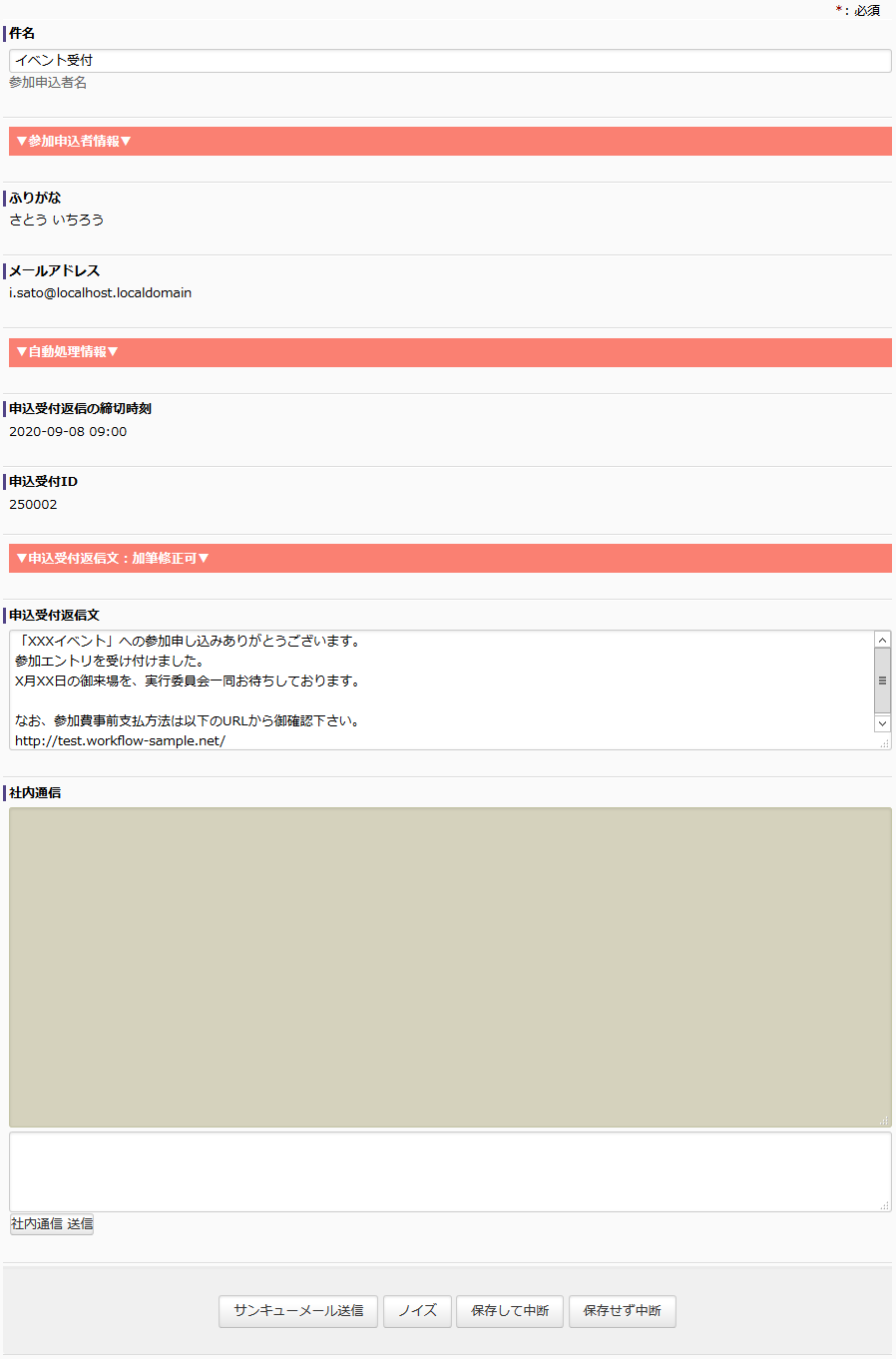 担当者に対し、フォームからの申込内容と、自動生成されたサンキューメールの文面を確認し、メールの文面を修正加筆するタスクが割り当てられます(2. サンキューメール文に追記)。担当者は必要に応じてメールの文面を修正加筆します。