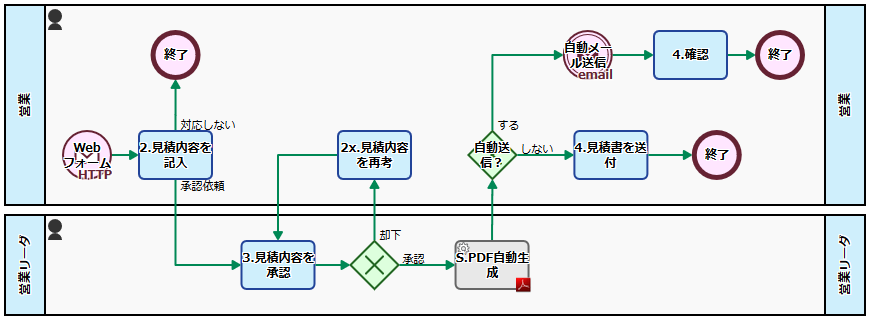 見積依頼に対応する場合には、自動的に営業リーダに見積内容を承認するタスクが割り当てられます。営業リーダが却下の判断をした場合、タスクは再度営業に戻されます。