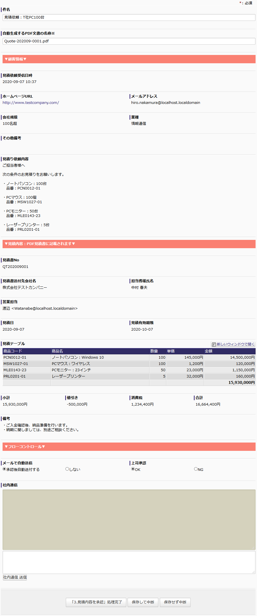 営業リーダが見積もり内容を承認すると、PDFで見積書が自動作成されます。