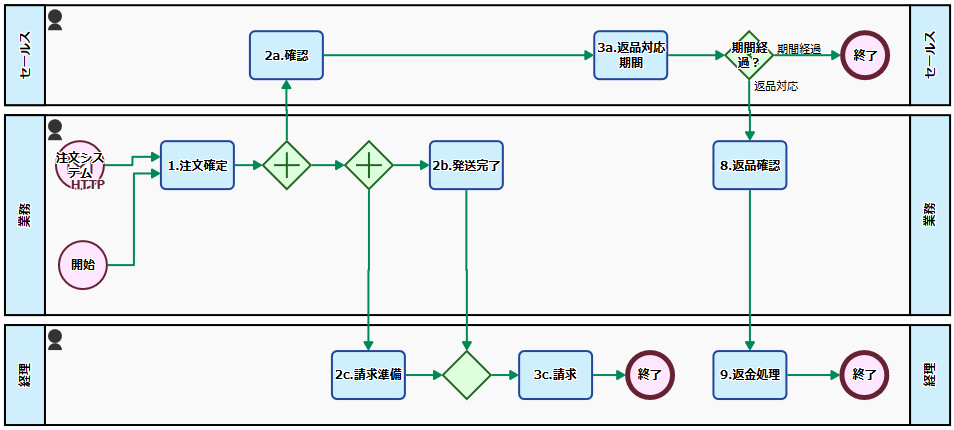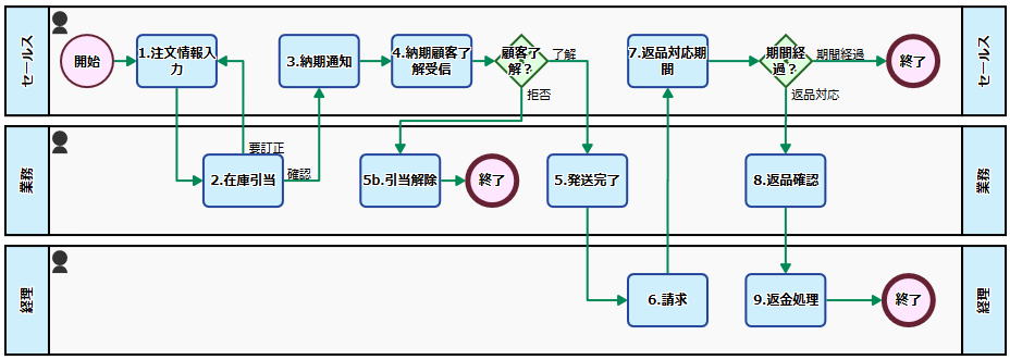 商品発送後は、セールスが顧客からの返品があるか待ちます(7. 返品対応期間)。返品期間内に返品が無ければプロセスは終了します。返品があった場合には、業務が返品対応を行い(8. 返品確認)、経理が返金処理を行い(9. 返金処理)、プロセスは終了します。