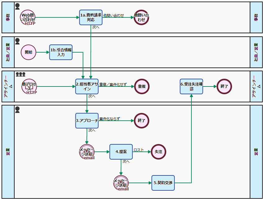 営業案件が発生すると、アサインチームが、内容を確認して担当営業を割り当てます(2.担当者アサイン)。ないしは、担当営業の割り当てが必要ない場合には、プロセスは終了します。