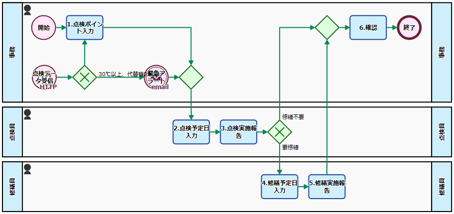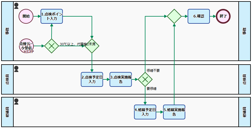 遠隔監視している機器からの異常データ発生を受け付け、点検員に点検作業を依頼、必要な場合は修繕作業を行う業務フローです。