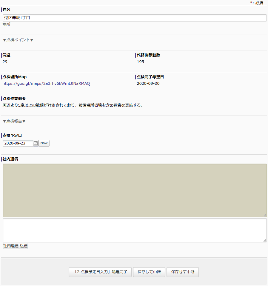 また、対応履歴はBPM上に蓄積されて参照できますから、過去の点検結果を参照し、このセンサー値の時の対応(対応が遅れたりしなかったか)と結果(点検結果はどうだったかなど)を確認しつつ、より良い条件設定を探ってゆくこともできます。