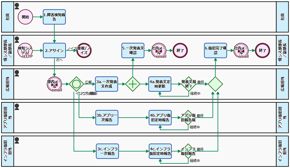 アサインされた各担当者の対応がすべて完了すると、情シス部部長/副部長が障害からの復旧を確認します。その後、障害対応が完了したことが社内にメールで通知され障害対応は完了します。