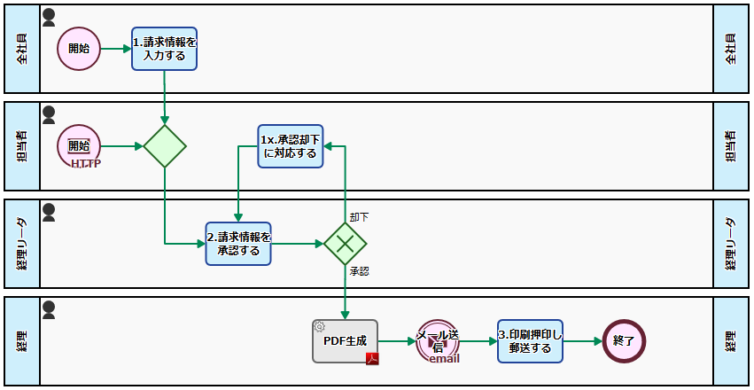 申請が行われると、自動的に内容の確認と承認作業の依頼が経理部門のリーダに割り当てられます。経理部門のリーダは内容を確認し、申請の承認ないしは却下をします。承認されれば引き続いて請求書の発行作業が行われ、却下された場合は自動的に担当者に差し戻されます。