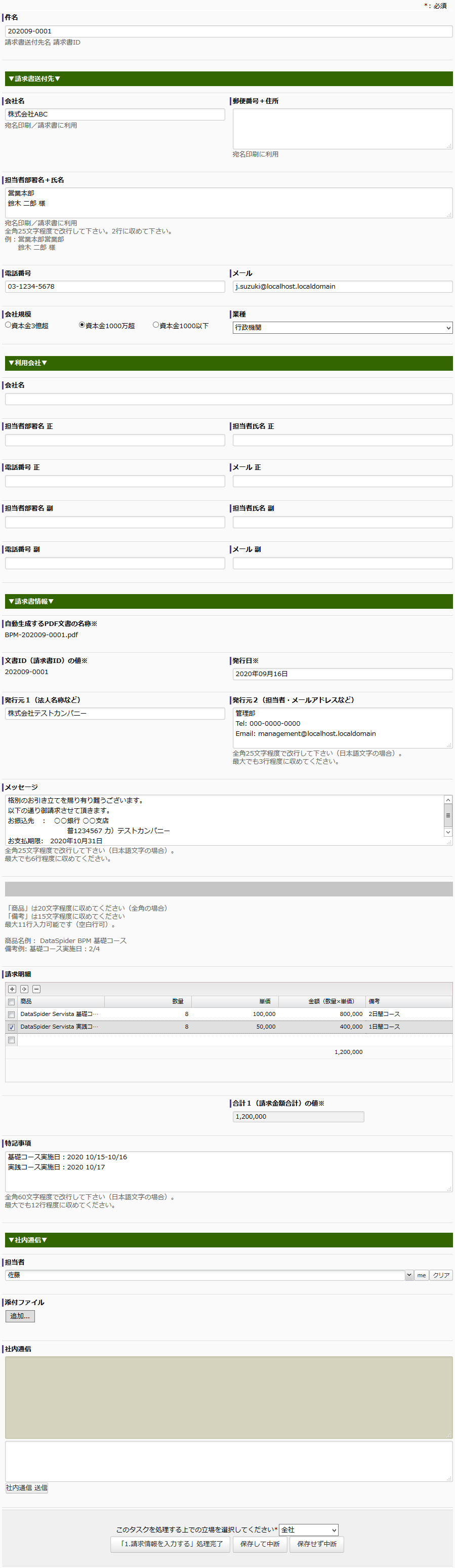 申請が承認されると、PDFの請求書が自動的に生成されます。経理担当者の作業は、PDFを印刷し押印して郵送する作業だけで済みます。