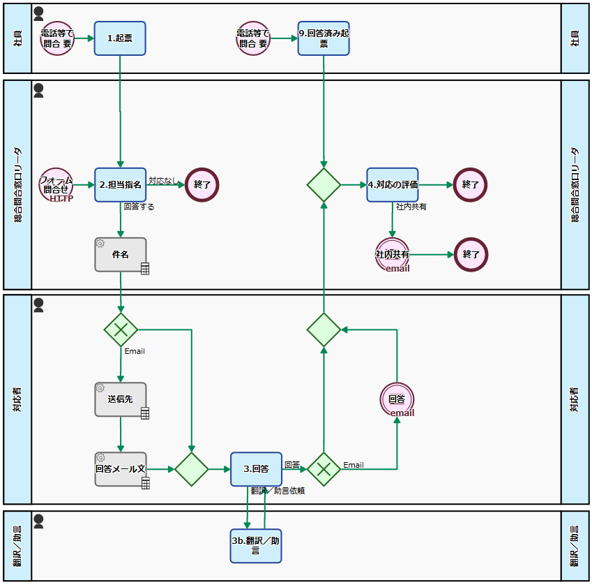 対応担当者は問い合わせに対する回答文を作成します(3. 回答)。また、必要な場合にはBPM上で他の人に翻訳をお願いしたり助言をお願いしつつ、回答文を作成することも出来ます(3b. 翻訳/助言)。
