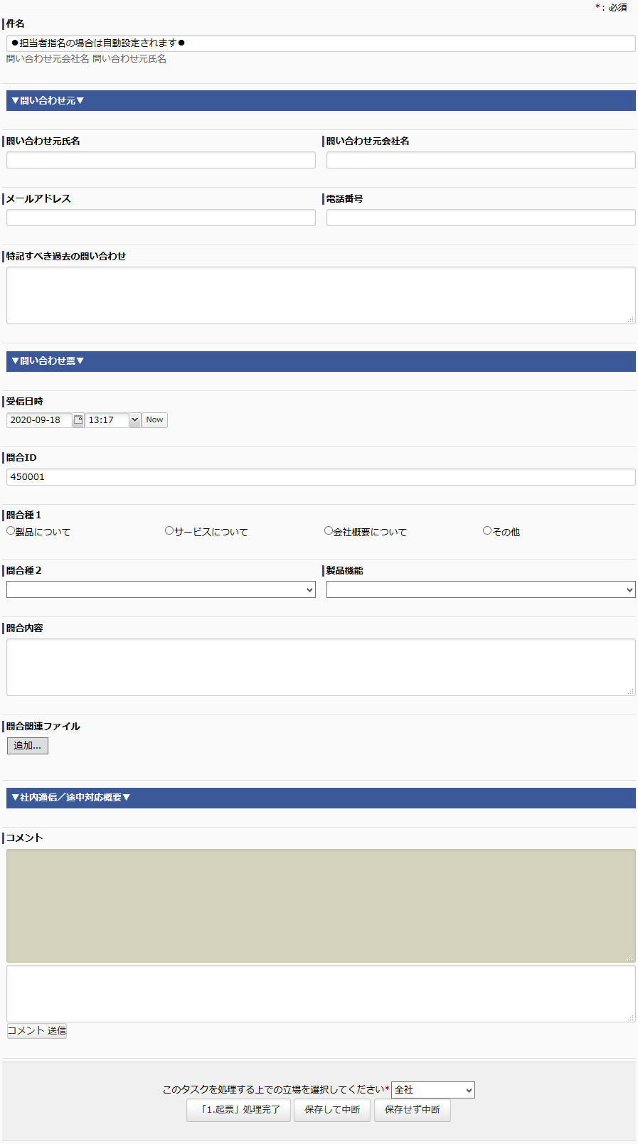電話で問い合わせを受け付けた場合、その場で問い合わせへの回答が済む場合があります。その場合は問い合わせ発生後に、対応が完了したことをBPMに入力します(9. 回答済み起票)。