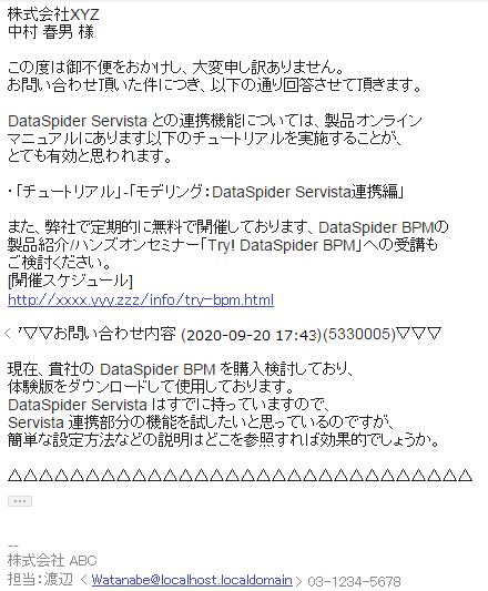 今回は、社外からの問い合わせ業務をBPM化しました。従来からの電話による問い合わせ対応に加えてWebフォームでの問い合わせにも対応し、問い合わせを受ける手段によらず統一的な対応を可能にしています。