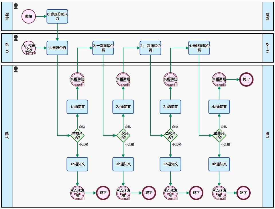 応募があると、応募書類の内容を確認するタスクが人事採用業務のリーダに割り当てられます。リーダは応募内容を確認して合格か不合格かを判断します(1. 書類合否判断)。