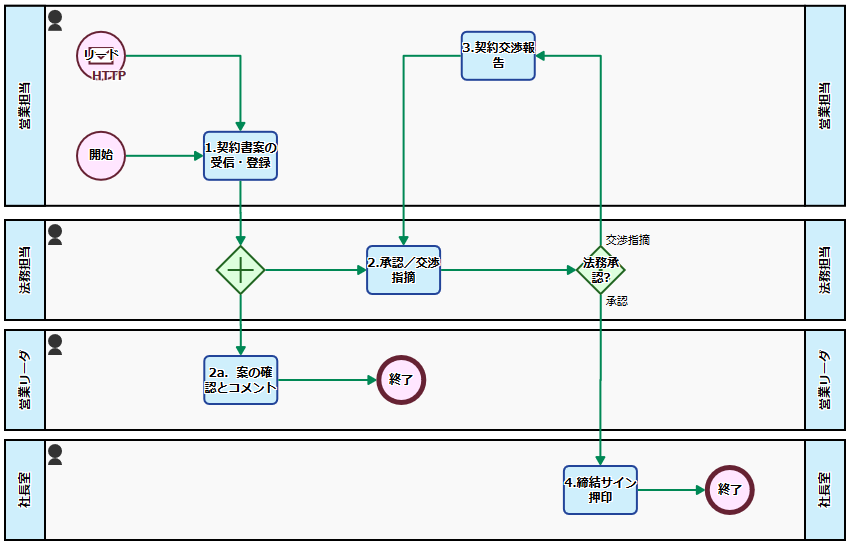 営業担当が作った/受け取った契約書案を、営業リーダと法務担当がチェック、営業リーダのコメントと、法務担当のチェックと交渉依頼を経て契約書が作成されるフローです。