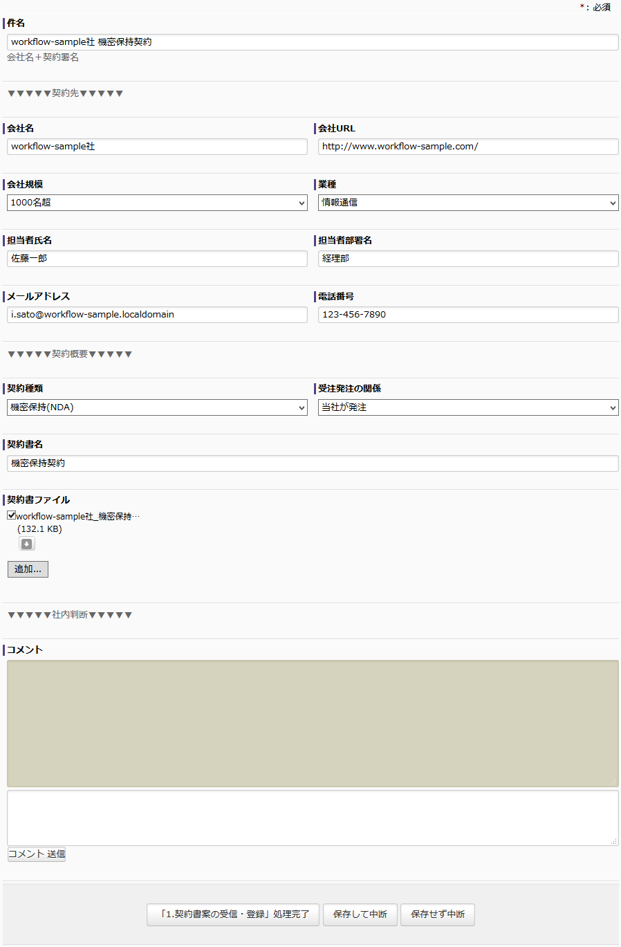 営業部門でのチェックと並行して、法務部門にも内容の確認とコメントを依頼するタスクが割り当てられます(2. 承諾/交渉指摘)。