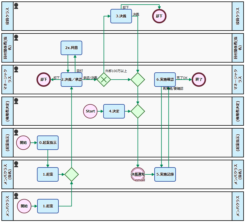 このプロセスフローの特徴は三つの承認経路があることです。まず、調達作業の担当者が自分で申請する経路(「1.起票」から)、他の人が担当者に調達作業をお願いする経路(「0.起票指示」から)、そして決済権限者自身が申請するため承認作業が不要となる経路です(「4.起票指示」から)。