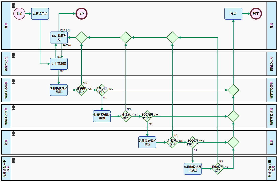 上司の承認後、決済金額に応じて、部長による承認(3. 部長決裁/承認)、役員による承認(4. 役員決裁/承認)、社長による承認(5. 社長決裁/承認)、取締役による承認(6. 取締役決裁/承認)が行われます。同じく、承認されなかった場合は提出者に差し戻しになります。