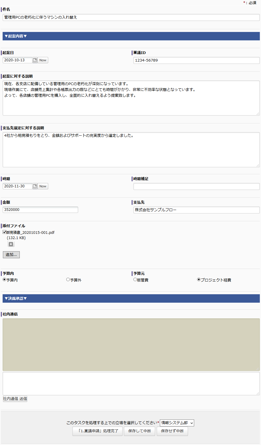 このプロセスは社員の誰でも開始することができます。決済稟議が必要な人は、このプロセスを開始し、申請する内容を入力します(1. 稟議申請)。