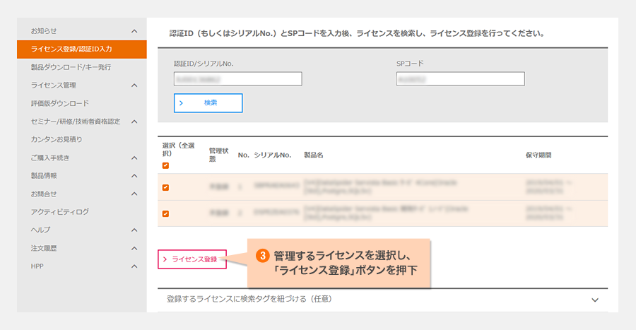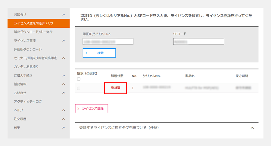 「ライセンス登録」ボタンを押下後に、管理状態で「登録済」と表示された場合、すでにライセンス登録が終わっていますので、ライセンス登録は不要です。