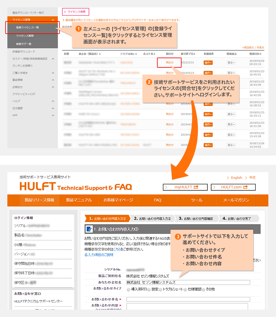 弊社ご契約のお客様は、myHULFTにログインし、登録したライセンスにより、技術サポートサービスをご利用いただくことができます。