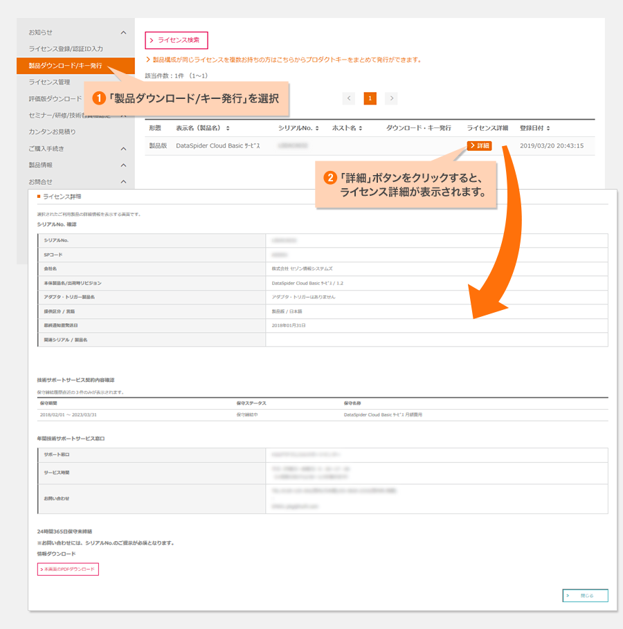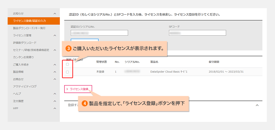 DataSpider Cloud の各種お問い合わせや契約内容の確認にはライセンスのご登録が必要です。