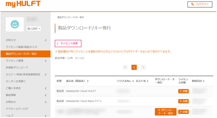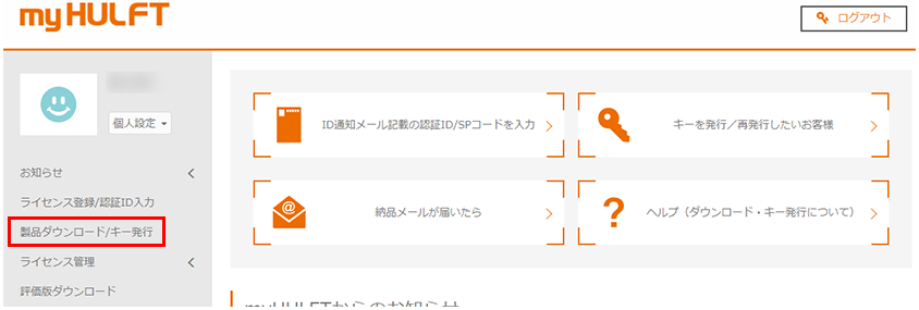 1.myHULFTにログインし、左メニューの [製品ダウンロード/キー発行]を選択します。