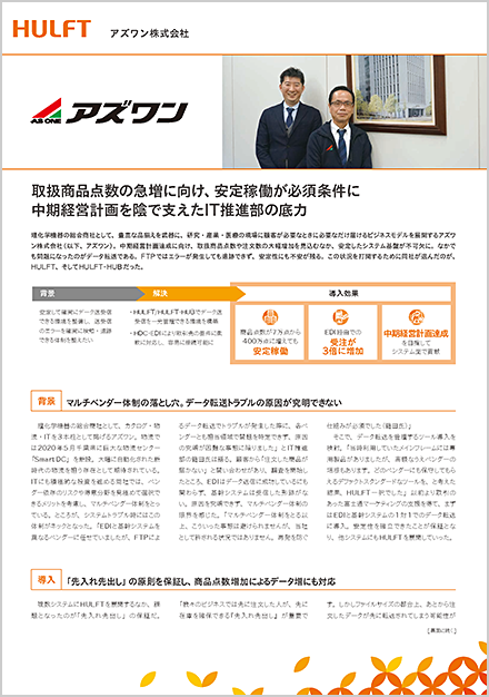 理化学機器の総合商社として、豊富な品揃えを武器に、研究・産業・医療の現場に顧客が必要なときに必要なだけ届けるビジネスモデルを展開するアズワン株式会社(以下、アズワン)。中期経営計画達成に向け、取扱商品点数や注文数の大幅増加を見込むなか、安定したシステム基盤が不可欠に。なかでも問題になったのがデータ転送である。FTPではエラーが発生しても追跡できず、安定性にも不安が残る。この状況を打開するために同社が選んだのが、HULFT、そしてHULFT-HUBだった。