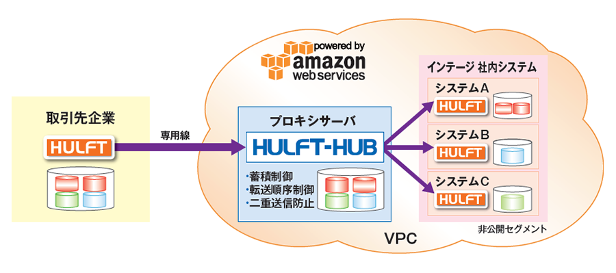 AWS上にプロキシサーバとして機能するHULFT-HUBを活用した中継サーバを構築。転送データはHULFT-HUBに蓄積され、転送開始の順序通りに送信する追越禁止の制御や、受信側サーバに障害が発生しても自動的に再送される機能がある。顧客システムとAWSは専用線でつながっている。
