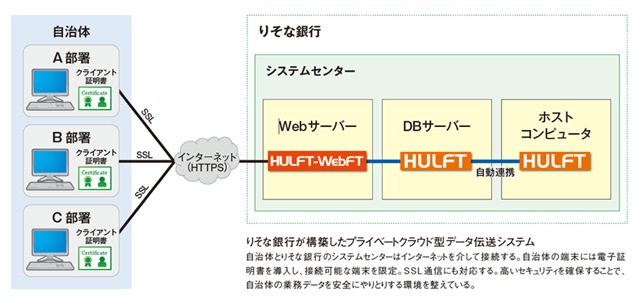 自治体とりそな銀行のシステムセンタ-はインターネットを介して接続する。自治体の端末には電子証明書を導入し、接続可能な端末を限定。SSL通信にも対応する。高いセキュリティを確保することで、自治体の業務データを安全にやりとりする環境を整えている。